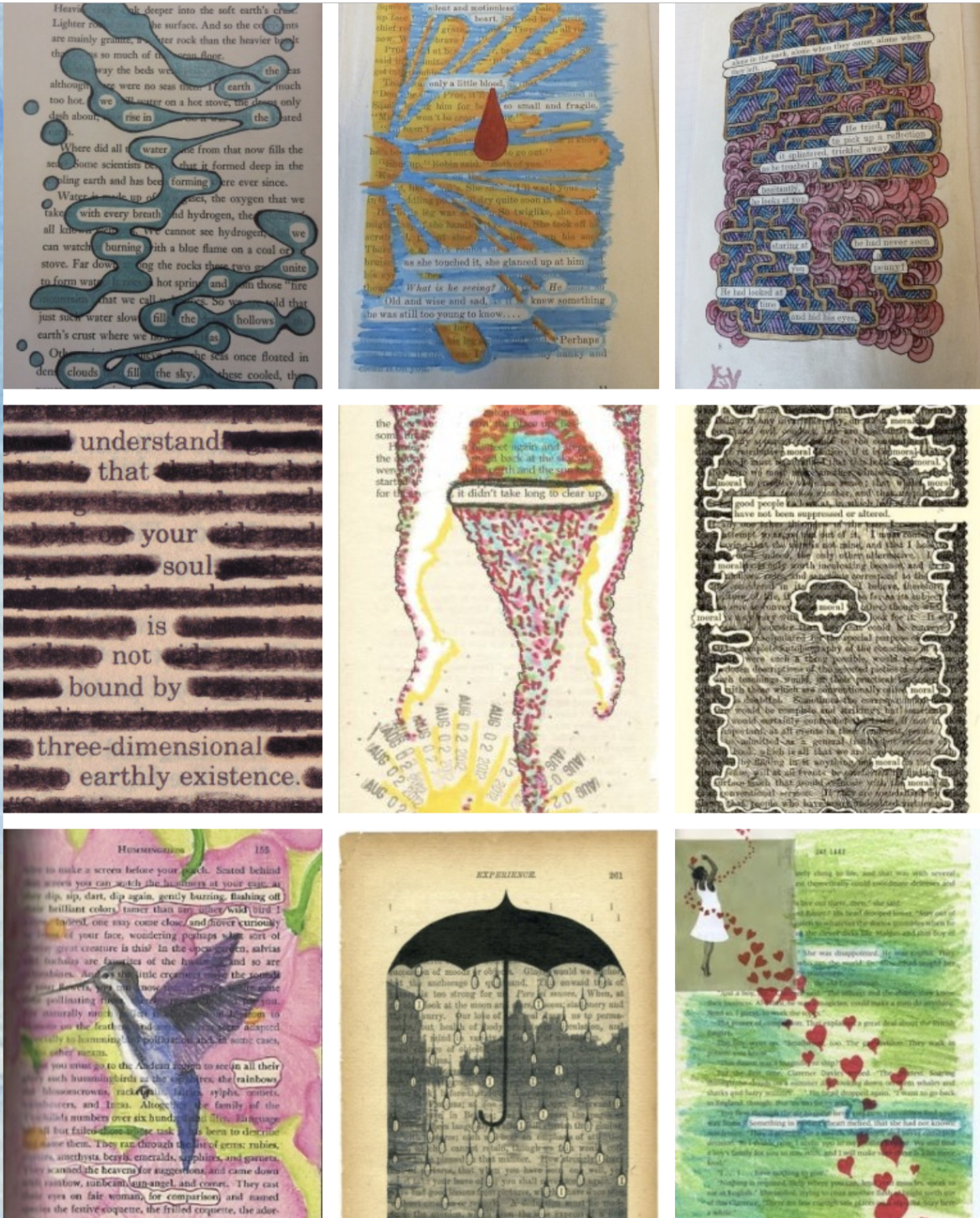 Altered-Book Poetry: These poems are common in altered-book journals (see here). It is often easier for people to take inspiration from the text on the page than to create their own poems from scratch. It could be a cohesive poem or a mix of random words that have meaning or stand out. Related art work is often incorporated into the page.